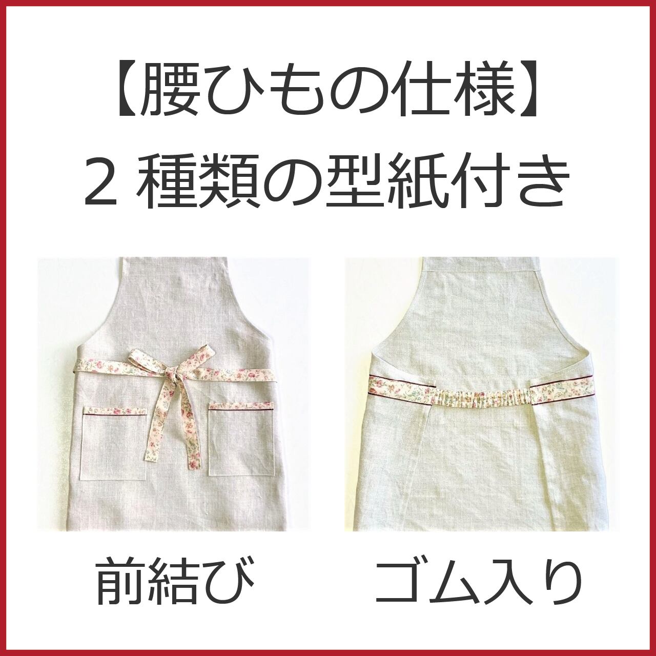 ・腰ひもは、ゴム入りと前結びの2種類の仕様の型紙と作り方の説明付きです