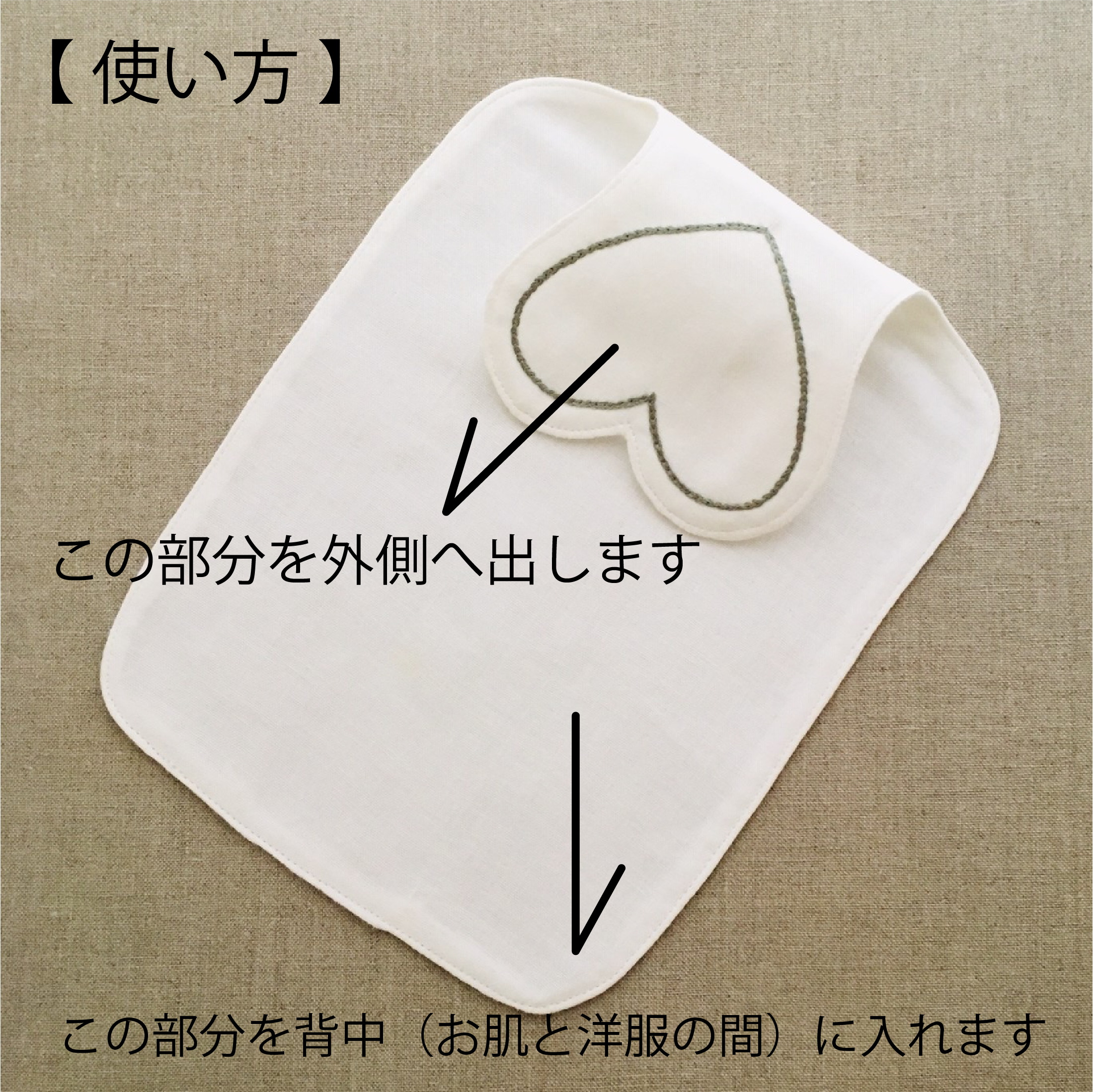 ・暑いシーズンは、肌着無しで直接洋服を着せることがあると思います。直接お洋服だと洋服が汗でべったり、そんなことありませんか? でも、肌着を着せるのは暑そう。そんな時に、汗取りパッドをお肌と洋服の間(背中)に入れてもらい、汗をかいたら交換。これで汗をかいても気持ちよく過ごせます。